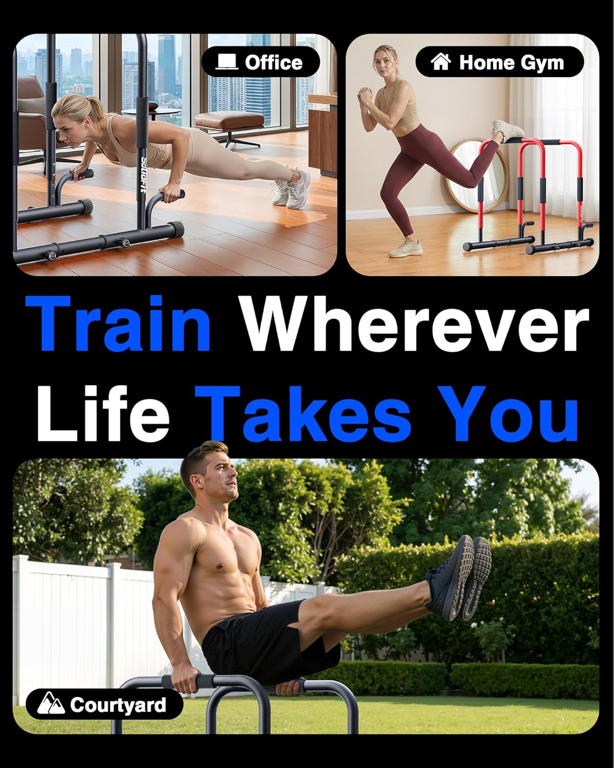 This 2-in-1 set works as both dip bars and push-up stands, ideal for dips, push-ups, leg raises, rows, and more. Effectively targets chest, arms, shoulders, triceps, and core—perfect for fitness and calisthenics training, as well as rehabilitation.